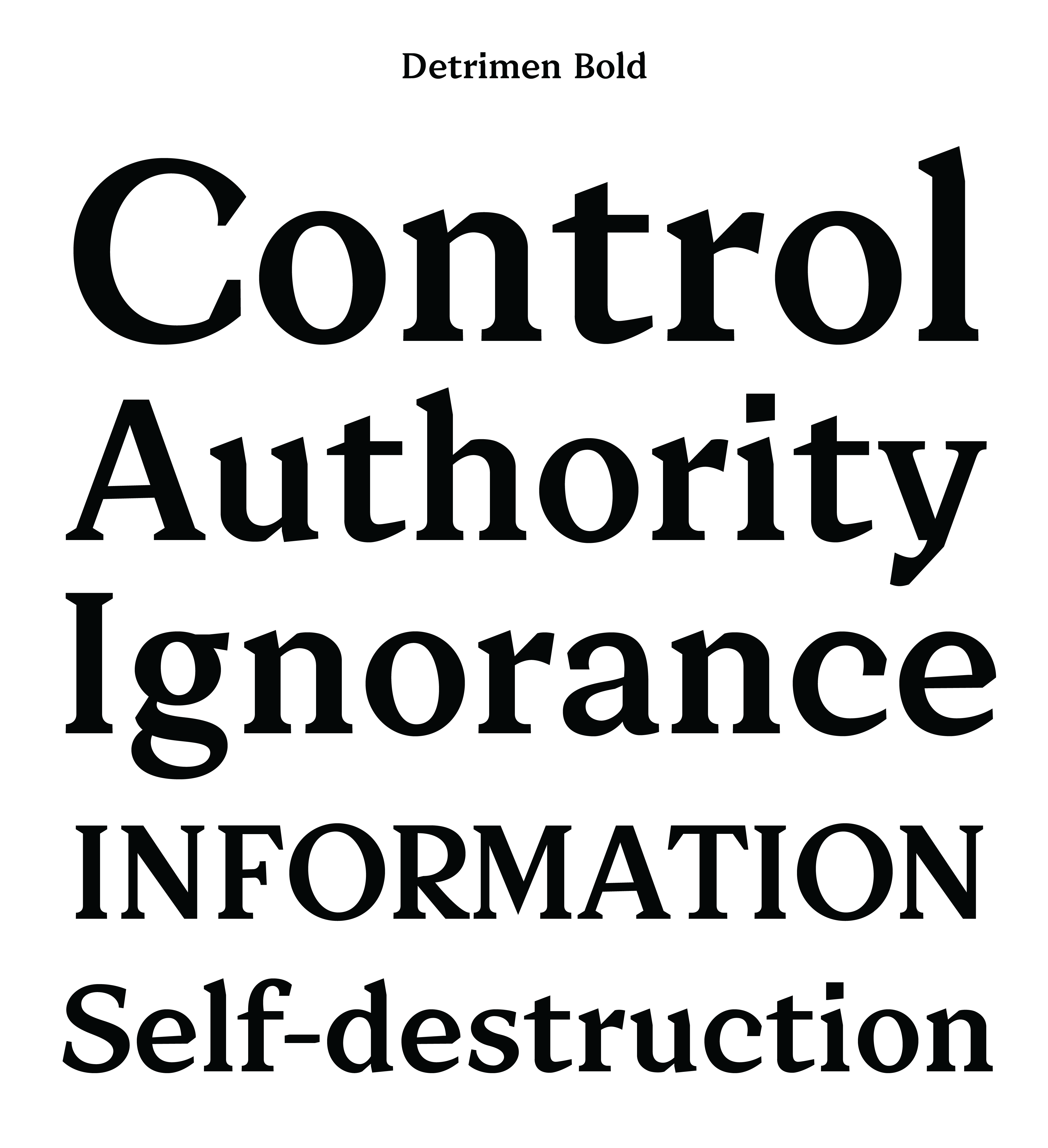 A typeface inspired by tabloid and newspaper texts, with an obsession for control—reflecting a conflicted world and psyche. In a dystopia where authority reigns unchecked and information is currency, Detrimen is optimized for reading, operating at small sizes, while lamenting humanity, one word at a time.