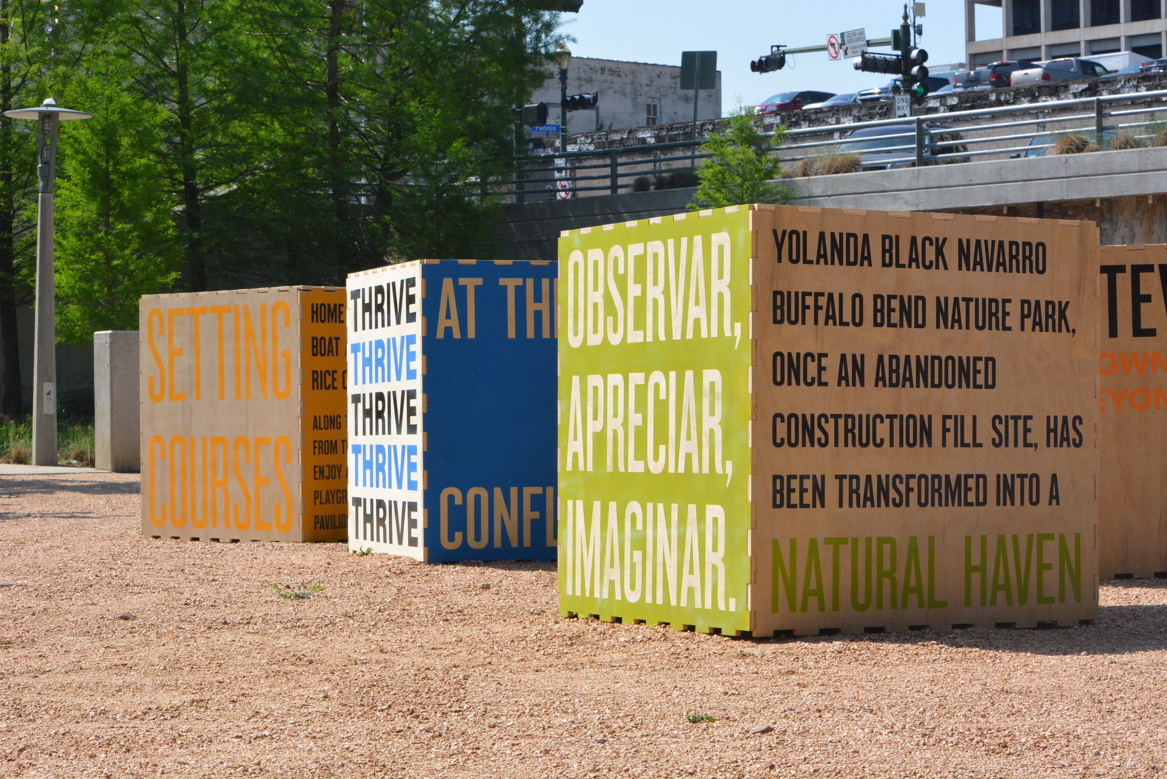 At Allen’s Landing, large-scale typographic cubes served as interactives that highlight the unique attributes of the six featured sites of the Encounter project along the Buffalo Bayou East Sector.